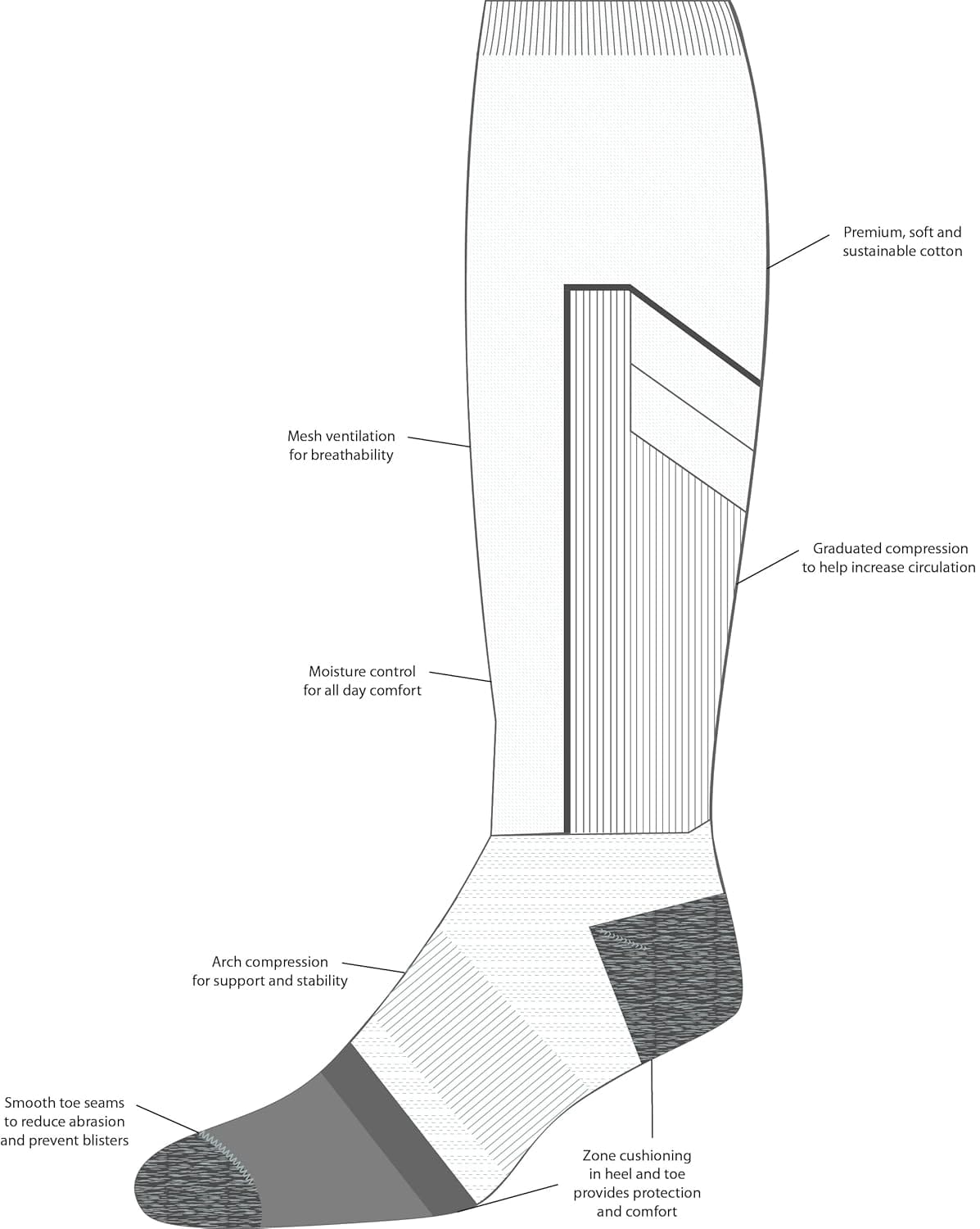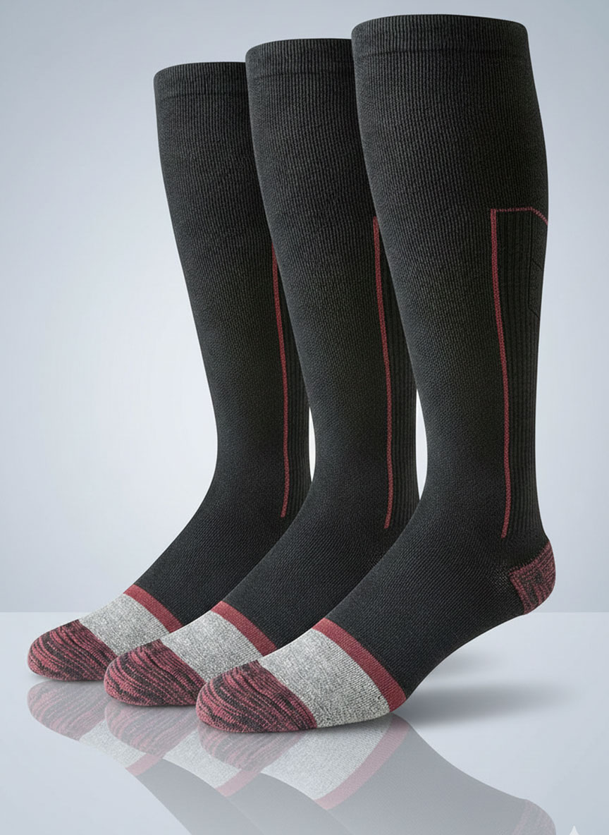 These compression stockings offer a snug fit from foot to calf, effectively providing the essential support needed for those long days on your feet or for extended travel. These over the calf socks for men can be a great component of nurse essentials, promoting healthy circulation and reducing fatigue. Crafted from a cotton elastane blend, our compression hose provides durability and optimal shape retention, making them highly desirable as compression stockings. The socks offer relief for legs and feet, a crucial feature for those managing swelling. As compression socks for flying, they maintain moisture management and zoned cushioning — making them great compression socks. The smooth toe construction eliminates bulky seams, improving comfort whether you’re at home or on the move. This makes them the ideal choice as compression socks for long flights. Available in multiple colors, these compression socks blend seamlessly into your wardrobe, offering a stylish yet practical solution for daily wear. Enjoy support, fit, and comfort with this must-have bundle of three pairs, designed to support an active lifestyle and promote overall leg health.
